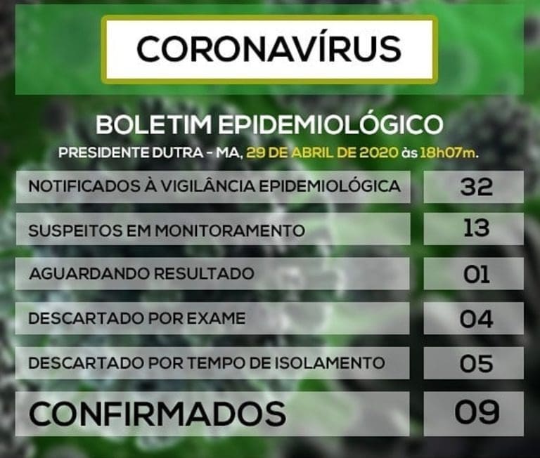 A Secretaria de Saúde de Presidente Dutra informou no boletim desta quarta-feira (29), que nas últimas 24 horas foram mais quatro casos confirmados de covid-19, o novo coronavírus no município, totalizando nove casos positivos.