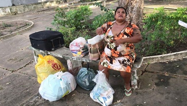Segundo informações, uma mulher com quem morava a expulsou da casa, um rapaz trouxe e deixou no banco da praça com todos seus pertences.