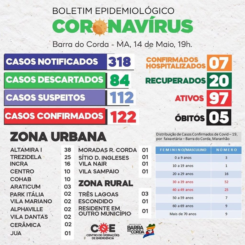 O boletim epidemiológico desta quinta-feira, 14 de maio, mostra que o município de Barra do Corda já contabiliza 122 casos confirmados da covid-19, o novo coronavírus, sendo que 97 estão ativos, 20 recuperados e 05 óbitos.