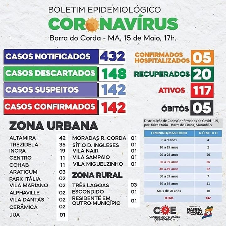 O boletim epidemiológico da Secretaria Municipal de Saúde de Barra do Corda desta sexta-feira (15), contabiliza 142 casos confirmados da covid-19, o novo coronavírus.