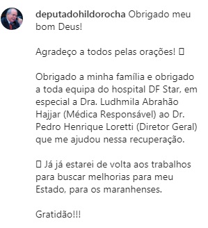 O deputado federal Hildo Rocha (MDB) estava internado em hospital de Brasília para tratamento da Covid-19. Hildo Rocha testou positivo no dia 28 de outubro.