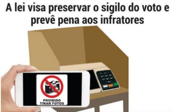 A Justiça Eleitoral alerta, filmar voto é crime tipificado no art. 312 do Código Eleitoral “Art. 312. Violar ou tentar violar o sigilo do voto: Pena – detenção até dois anos”. Essa proibição foi incluída na Lei das Eleições em 2009 e se encontra em vigor desde então, conforme consta no parágrafo único do art. 91-A: “Fica vedado portar aparelho de telefonia celular, máquinas fotográficas e filmadoras, dentro da cabine de votação.”.