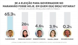 De acordo com o levantamento, Dino possui 65,3%, contra 26% de Roseana, Roberto Rocha soma 4,6%, Maura Jorge 3,9% e Ricardo Murad 0,2%. A pesquisa do Instituto Interpreta foi realizada no dia 10 de novembro em Imperatriz, e ouviu 600 pessoas. O levantamento tem margem de erro de 4 pontos percentuais.