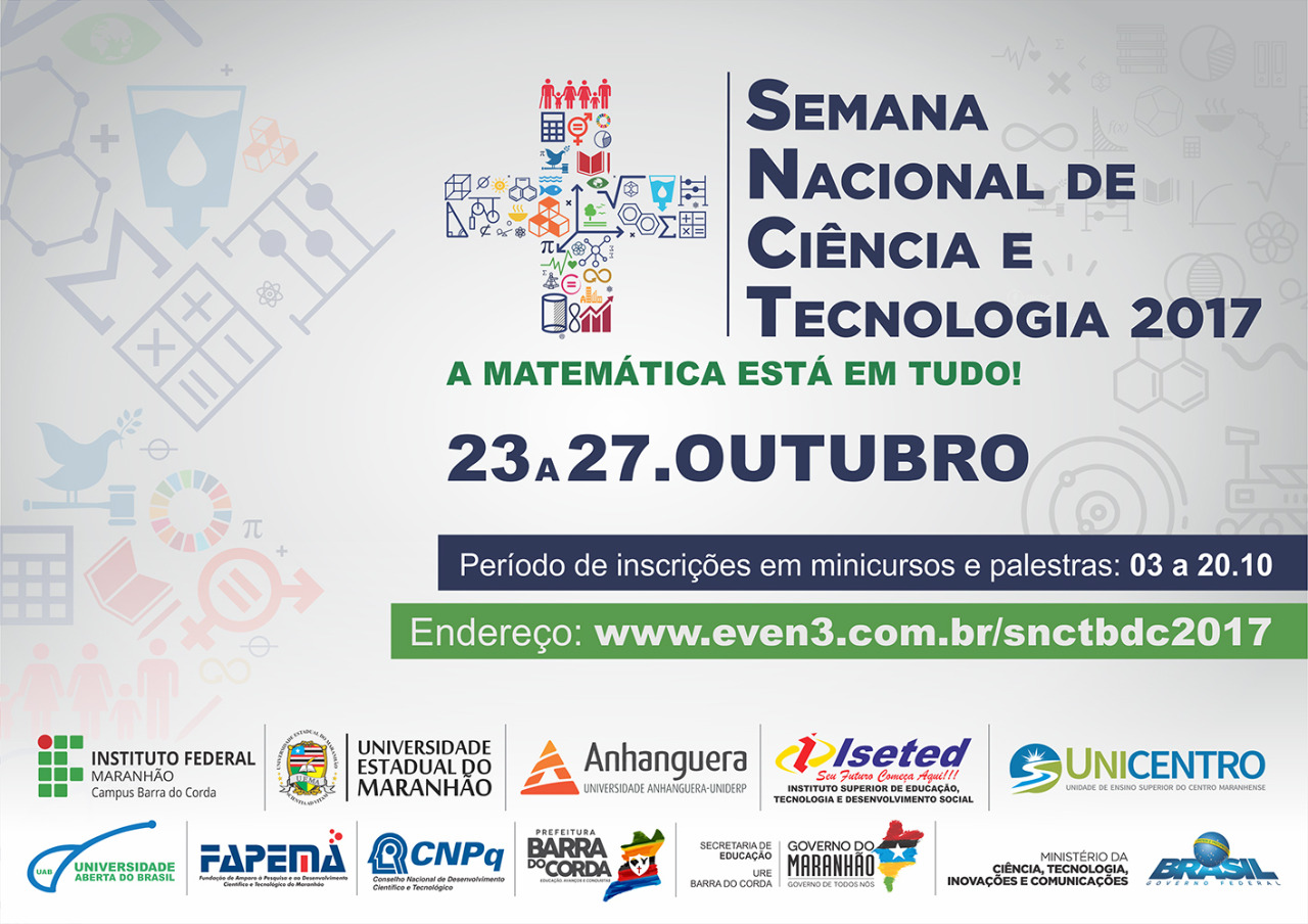 Entre os dias 23 e 27 de outubro, ocorrerá a 7ª edição da Semana Nacional de Ciência e Tecnologia (SNCT) em Barra do Corda – MA. O evento é uma realização do IFMA – Campus Barra do Corda, em parceria com a Universidade Aberta do Brasil (UAB), Universidade Estadual do Maranhão (UEMA), Unidade Regional de Educação de Barra do Corda (URE), Faculdade Anhanguera, Instituto Superior de Educação, Tecnologia e Desenvolvimento Social (ISETED) e Unicentro.