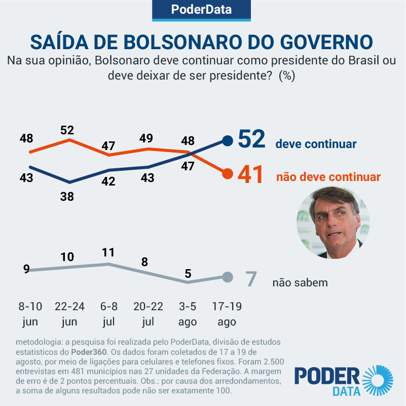 Pesquisa PoderData mostra que 52% dos brasileiros acham que Jair Bolsonaro deve continuar na Presidência. Houve aumento de 5 pontos percentuais em relação ao último levantamento, realizado de 3 a 5 de agosto. Antes, 48% defendiam sua permanência.